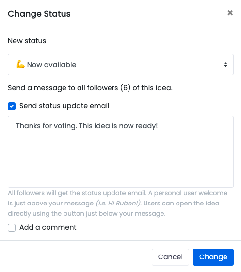 When you change theĀ statusĀ you can directly inform your customers by adding a comment or sending them an email with the update.
