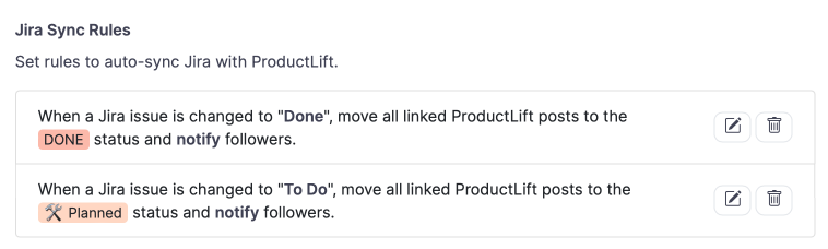 To keep your ProductLift roadmap and your Jira project in sync, you can enable status synchronization.