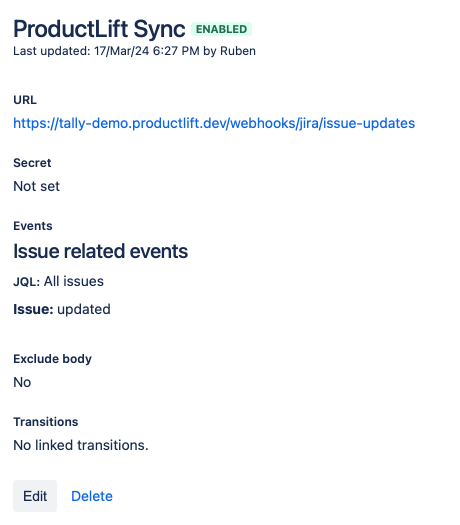 To initiate, ensure the integration between ProductLift and Jira is enabled.