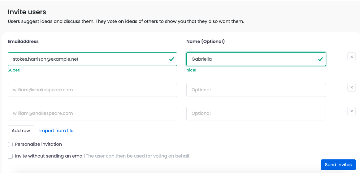 You can easily invite one or more customers at the same time, by letting ProductLift send an email. Just fill in the email address and the name of your customer and ProductLift will send the email. You can also upload a file with all users.